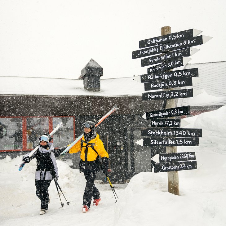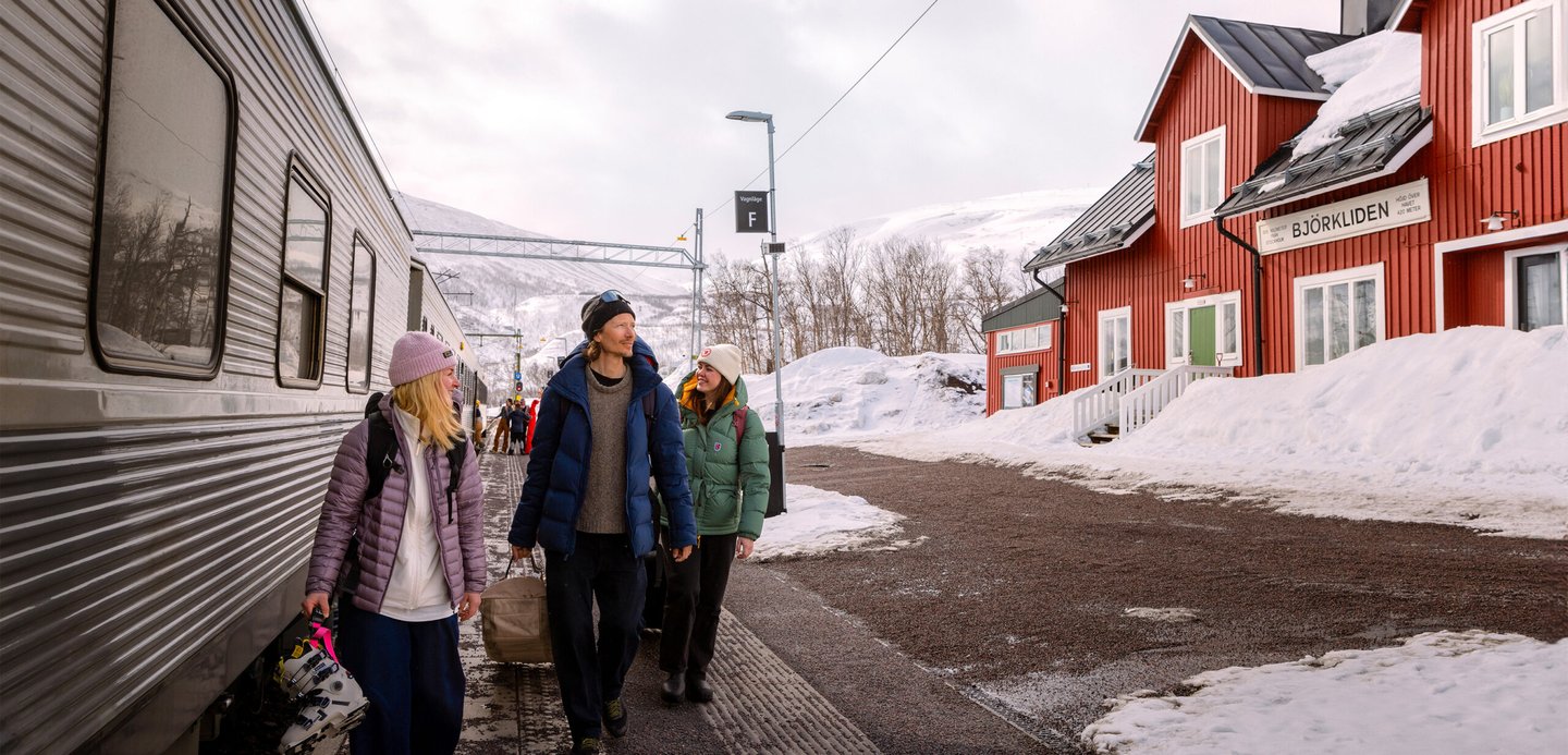 Bra att veta: Björkliden station ligger några hundra meter från Fjällbyn och Hotell Fjället. Du kan boka skjuts till dina väskor genom att ringa till receptionen, sen är det en kort men frisk promenad uppför backen (om du inte har bokat Arctic Ski Bus) – en perfekt första start på ditt fjälläventyr!